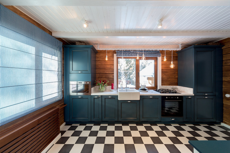 В целом гармонично и легко для деревянного дома. Удачно подобрано цветовое сочетание (с учетом зимнего пейзажа — особенно), зонирование, можно сказать традиционно. Удалась зона кухни. И мойка у окна — на мой взгляд, самый удобный вариант расположения для загородного дома. Такое решение кухни хорошо использовать и в городской квартире.