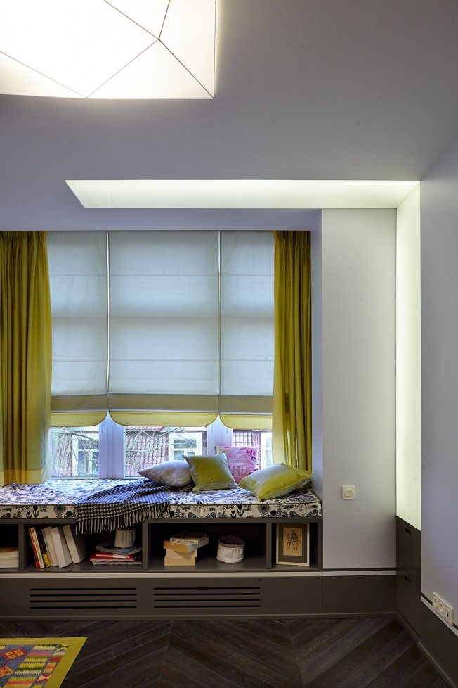 Эклектика очень ненавязчивая, очень умеренная. Приятная квартира. Прекрасное окно — со сложной занавеской и лежанкой-подоконником-полкой под ним, великолепные зеркала, интересное применение килиму в спальне (вместо картины над изголовьем)… Понравилось неслащавое оформление детской, ничего плохого с ребенком не случится, это лишь декор, а ребенок еще успеет откорректировать все под себя.
