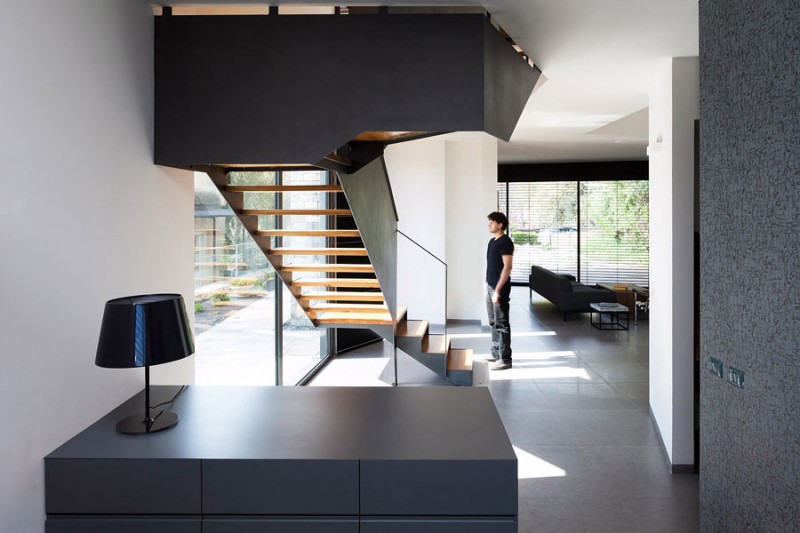 Дом моей мечты, большой, светлый, строго обставленный, с удобной красивой лестницей. Кабинет и детская игровая на первом этаже, как я понимаю, отделены от общего пространства подъемом на три ступеньки, а перегородок нет? Тогда это еще один плюс этому проекту. Нет гардеробных, но много встроенных шкафов — отлично. Красивый стеклянный фасад стенки для холодильника и духовки. Мебель нравится, стильная. У прачечной есть свой балкончик, если не хочется сушильный автомат запускать — пожалуйста, суши на раскладной проволочной сушилке. Причудливая трапециевидная форма дома, опять же по моему мнению, вызванная формой земельного участка, дому только на пользу. Минусов вижу только два, да и то от зависти: виды из окон на забор и неухоженную соседскую территорию не вдохновляют (хотя там есть пара мандариновых деревьев, но в остальном сорняки и неухоженность, прям как не в Израиле) и маленький детский санузел на 2-м этаже. Даже не представляю, как там умудрились душевую устроить.