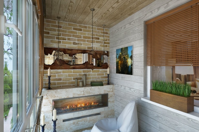 Первый раз вижу камин на балконе.Отличная идея.И зеркало красиво смотрится и много приятных деталей и все к месту.Браво!